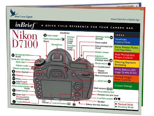 Nikon D7100 inBrief : A laminated reference card for your camera bag. Your new Nikon D7100 has many controls and settings designed to allow you to make a perfect exposure. But remembering where they are and how the features work together can be daunting. If you decide to carry the user manual in your bag but finding the answer to your question can be a frustrating experience. That is why Blue Crane Digital developed an abbreviated field reference guide for your digital SLR. The inBrief reference card answers most camera operation questions quickly and easily. The information is arranged logically for ease of use. The reference card is laminated with foldable hinges so it lies flat and is easily stored in your camera bag. The first panel contains a color-coded index to the rest of the panels. For instance, if you have a question about white balance, just check the index and find your answer on the purple panel. An overview of the information for each of the panels is listed below. Gray: Annotated Line Drawing, Quick Button Reference. Blue: Viewfinder, Control Panel. Lime: Focus, Release Modes, Live View, Video. Red: Flash Photography, Picture Controls. Yellow: Metering, Exposure, Bracketing. Purple: White Balance, ISO, Quality and Size. Orange: Playback Images, Reset Controls. Green: Custom Settings. Once you have the inBrief reference card, you can leave your manual at home!