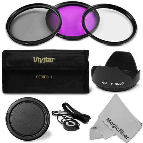 - Kit Includes: 52MM Vivitar Filter Kit (Ultraviolet UV, Circular Polarizer CPL, Fluorescent FLD) + Filter Carry Pouch + Tulip Flower Lens Hood + Snap-ON Lens Cap w/Cap Keeper Leash + MagicFiber Microfiber Lens Cleaning Cloth