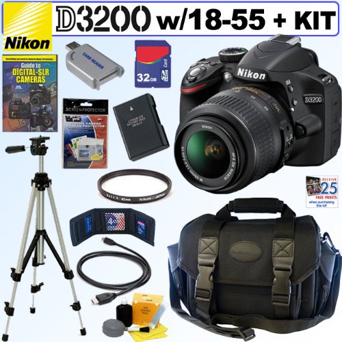 A new level of image quality, a familiar way of sharing.Nikon D3200 HD-SLR camera: Don't let the D3200's compact size and price fool you-packed inside this easy to use HD-SLR is serious Nikon power: a 24.2 MP DX-format CMOS sensor that excels in any light, EXPEED 3 image-processing for fast operation and creative in-camera effects, Full HD (1080p) movie recording, in-camera tutorials and much more. What does this mean for you? Simply stunning photos and videos in any setting. And now, with Nikon's optional Wireless Mobile Adapter, you can share those masterpieces instantly with your Smartphone or tablet! Nikon AF-S DX-Nikkor 18-55mm f3.5-5.6G VR Nikkor Zoom Lens: Featuring a built-in Silent Wave Motor and Vibration Reduction (VR). The AF-S DX-Nikkor 18- 55mm f3.5-5.6G VR is an affordable, and compact, 3x zoom lens covering the most frequently used focal range of 18-55mm with amazing versatility.++PLUS++ 32GB Dlx Accessory Kit: 32GB SDHC Memory Card - Card Reader - Memory Card Wallet - Spare EN-EL14 Rechargeable Lithium-ion Battery - Nikon 52mm Soft Focus 1 Filter (reduces sharpness & contrast) - Lens Care & Cleaning Kit - SLR Camera Gadget Bag - LCD Screen Protectors - Full Size 59" Tripod W/Case - Jumpstart DVD for SLR - HDMI cable for HDTV connection - Free 25 Prints.