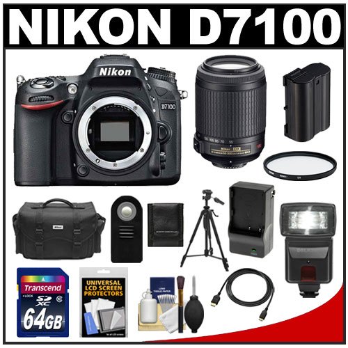 Kit includes: 1) Nikon D7100 Digital SLR Camera Body 2) Nikon 55-200mm f/4-5.6G VR DX AF-S ED Zoom-Nikkor Lens 3) Nikon Deluxe Digital SLR Camera Case - Gadget Bag 4) Transcend 64GB SecureDigital SDXC Class 10 Ultra Speed Ultimate Card 5) Spare EN-EL15 Battery for Nikon 6) Battery Charger for Nikon EN-EL15 7) Vivitar 52mm UV Glass Filter 8) Zeikos ML-L3 Wireless Shutter Release Remote Control 9) Precision Design DSLR300 High Power Auto Flash 10) PD-58PVTR 58" Photo/Video Tripod with Case 11) PD HDMI to Mini-HDMI (C) Gold Audio/Video Cable (6') 12) PD 6-Piece Camera & Lens Cleaning Kit 13) PD Memory Card Storage Wallet 14) LCD Monitor Screen Protectors The Nikon D7100 Digital SLR Camera features a 24.1-megapixel DX-format image sensor, built-in HDR, mobile connectivity and full HD 1080p video. Enjoy speed, precision and convenience at every step, from shooting up to 6 fps to instantly sharing your shots with the optional WU-1a Wireless Mobile Adapter. The Nikon 55-200mm VR Zoom Lens is a versatile and ultra-compact telephoto zoom lens that offers a 3.6x zoom range and a Vibration Reduction (VR) System. Constructed from water-repellant, durable, ballistic nylon, this Nikon compact system case stores your digital SLR camera, plus lenses and accessories.Take pictures with this Transcend 64GB eXtended-Capacity SecureDigital (SDXC) Class 10 memory card.Increase your shooting capacity with this EN-EL15 Lithium-ion rechargeable battery. This Precision Design DSLR300 Universal High-Power Flash reduces shadows and adds depth to your pictures. Avoid camera shake by setting your camera on this sturdy, lightweight 58-inch tripod.