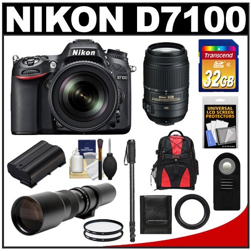 Kit includes: 1) Nikon D7100 Digital SLR Camera & 18-105mm VR Zoom Lens (Black) 2) Nikon 55-300mm f/4.5-5.6G VR Zoom-Nikkor Lens 3) Samyang 500mm f/8.0 Telephoto Lens (T Mount) 4) Transcend 32GB SecureDigital Class 10 (SDHC) Card 5) Spare EN-EL15 Battery for Nikon 6) Vivitar 67mm UV Glass Filter 7) Vivitar 58mm UV Glass Filter 8) Zeikos ML-L3 Wireless Shutter Remote 9) Rokinon M67 67" Pro Monopod 10) PD Multi-Use DSLR Camera Backpack Case (Black/Red) 11) PD 6-Piece Camera & Lens Cleaning Kit 12) PD Memory Card Storage Wallet 13) PD T Mount for Nikon 14) LCD Monitor Screen ProtectorsThe Nikon D7100 Digital SLR Camera features a specially designed 24.1-megapixel DX-format image sensor, superior low-light performance, ultra-precise autofocus and metering, advanced video recording features, built-in HDR, weather sealing, continuous shooting up to 6 fps, Full HD 1080p video, and much more! This outfit includes the AF-S 18-105mm f/3.5-5.6G ED VR 5.8x zoom lens.The Nikon AF-S 55-300mm ED VR Zoom Lens is a 5.5x zoom lens. Vibration Reduction reduces the effects of camera shake.This powerful Samyang 500mm f/8 Manual Focus Telephoto Lens utilizes aluminum alloy construction, computer-designed all-glass optics and the latest optical multi-coating techniques to provide crisp, high-contrast, virtually flare-free images.Take more high-resolution pictures faster (10MB/sec. minimum) with this 32GB High-Capacity SecureDigital (SDHC) Class 10 memory card.Increase your shooting capacity with this powerful EN-EL15 Lithium-ion rechargeable battery.The Precision Design PD-BPR Backpack is a comfortable, multi-use storage solution for your DSLR, laptop, and/or tablet. The main compartment can hold most SLR bodies and several lenses and flashes.
